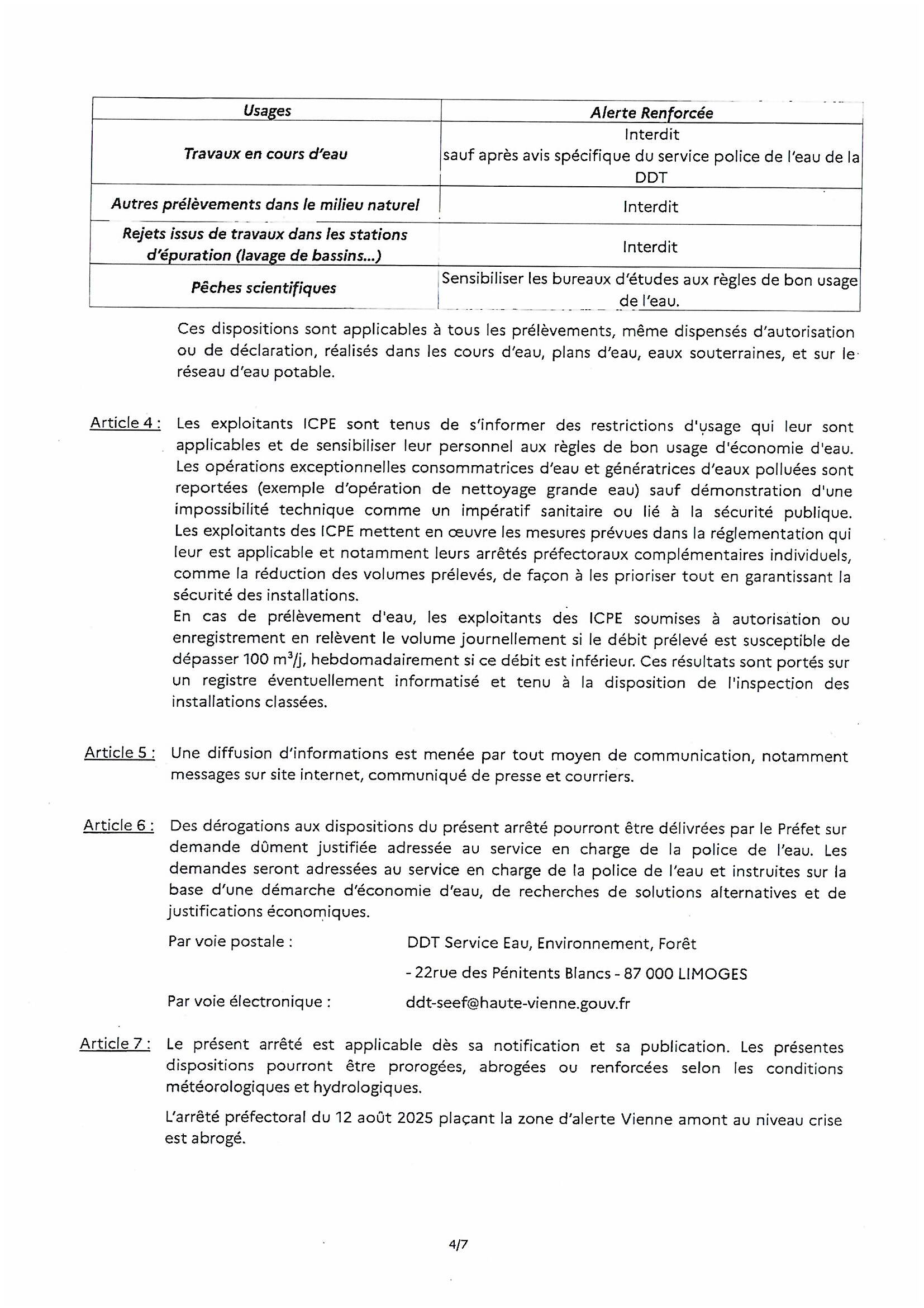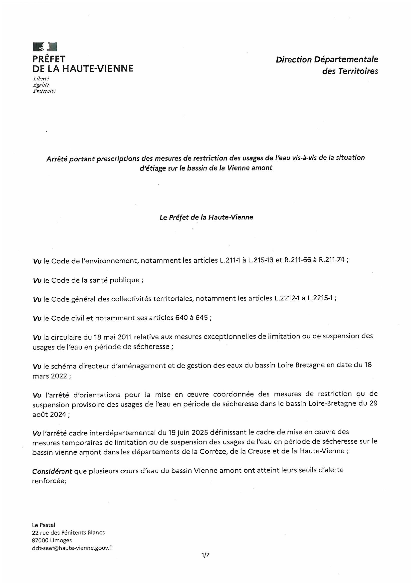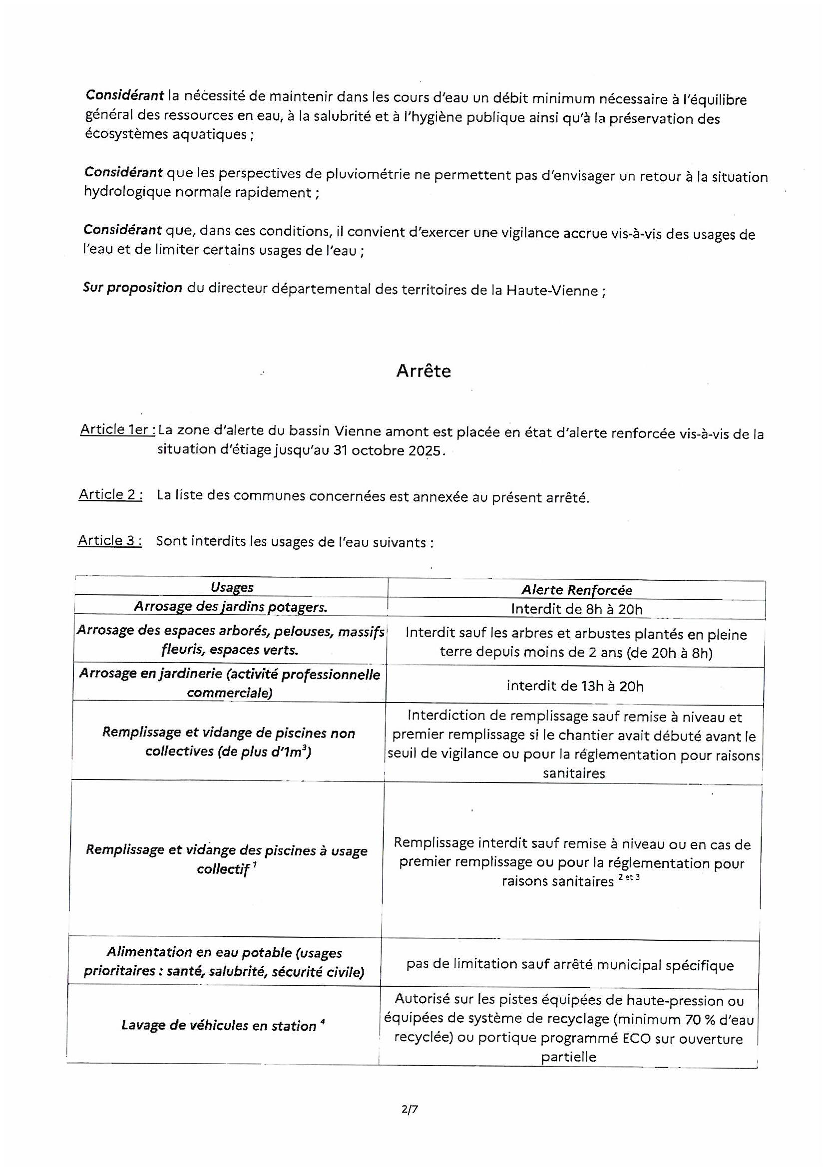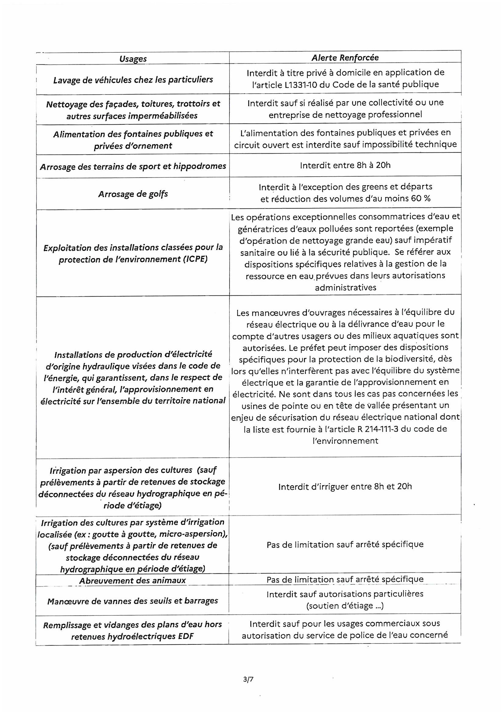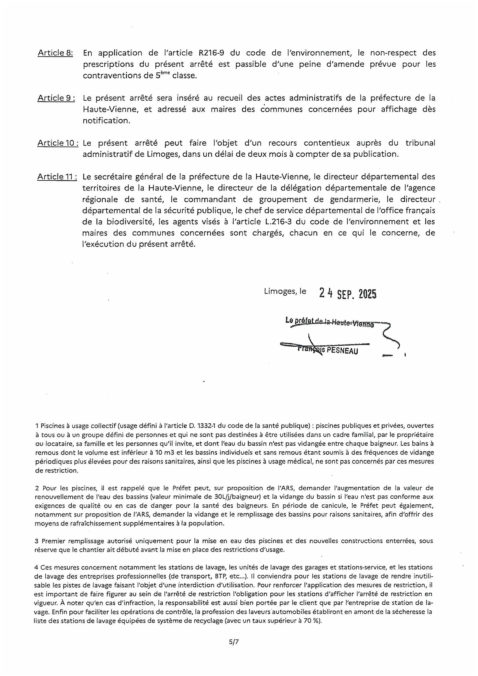 ARRÊTÉ PORTANT PRESCRIPTIONS DES MESURES DE RESTRICTION DES USAGES DE L’EAU DU 24 SEPTEMBRE 2025