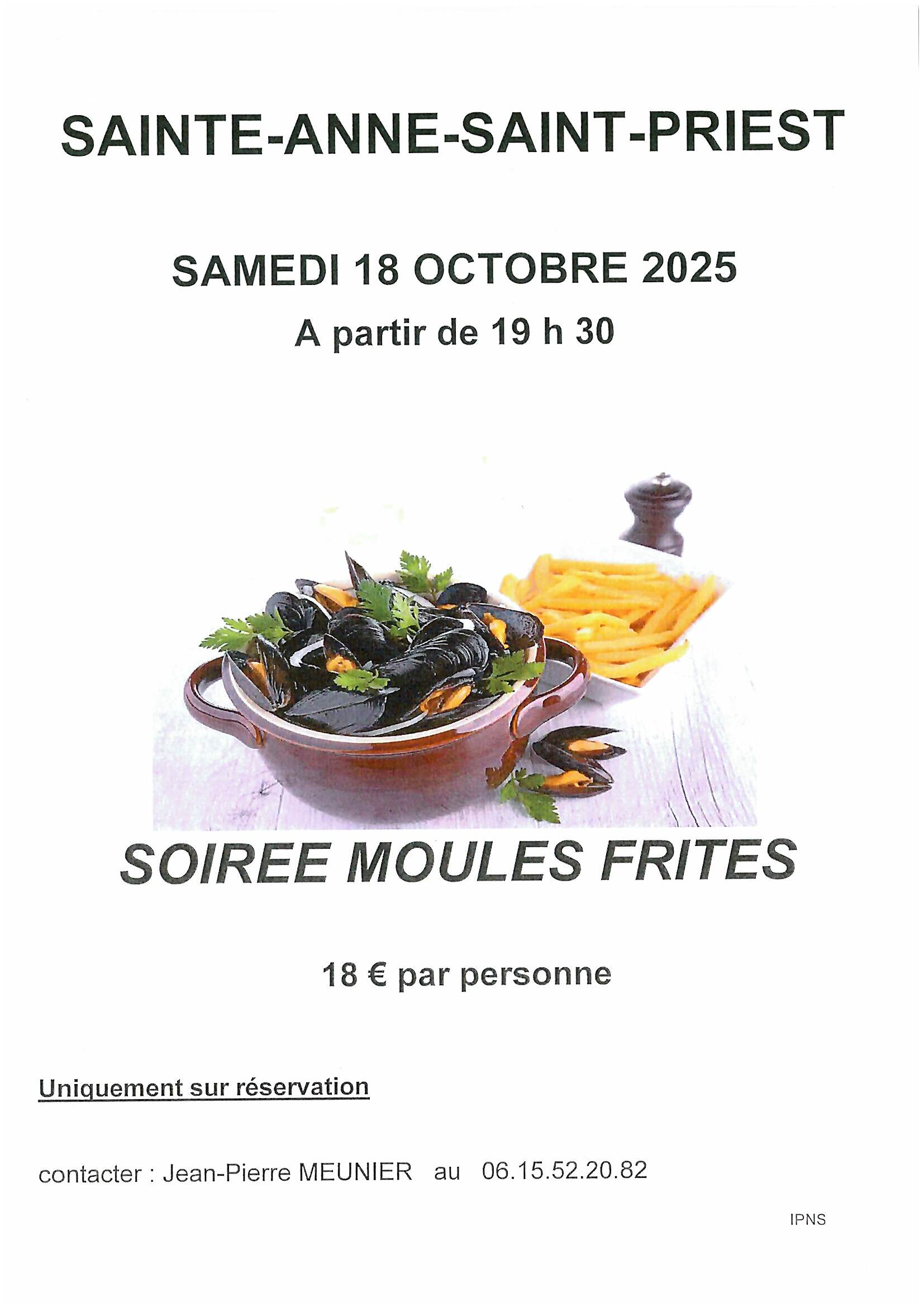 SOIRÉE MOULES FRITES – SAMEDI 18 OCTOBRE 2025 – SAINTE-ANNE-SAINT-PRIEST