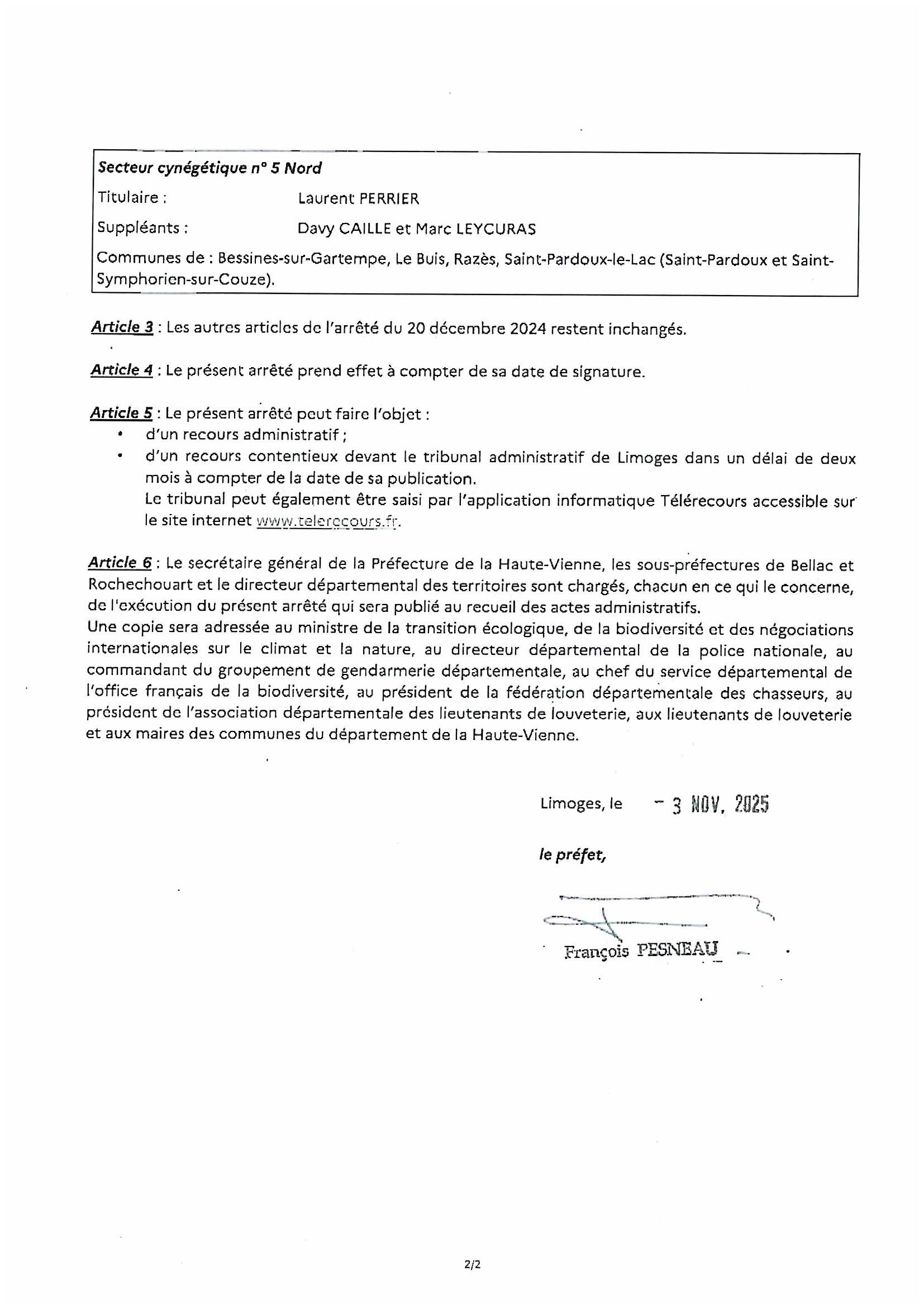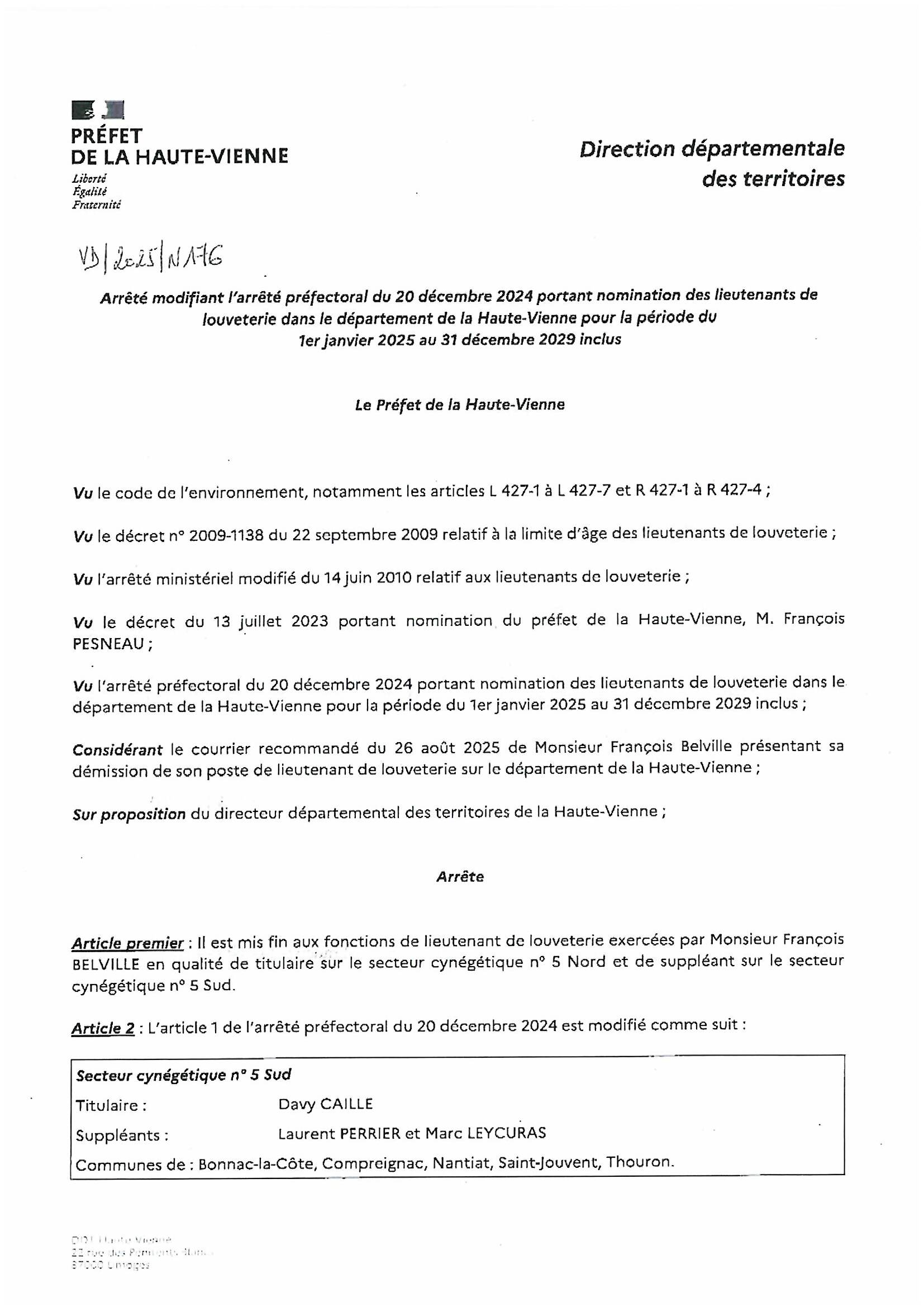 ARRETE PORTANT NOMINATION DES LIEUTENANTS DE LOUVETERIE DU 1ER JANVIER 2025 AU 31 DECEMBRE 2029