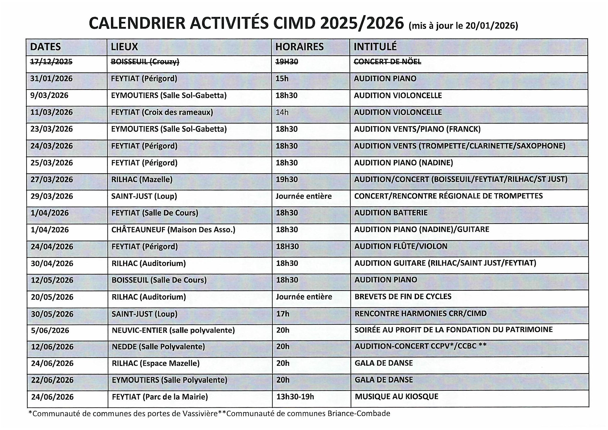 CALENDRIER ACTIVITES CIMD 2025/2026