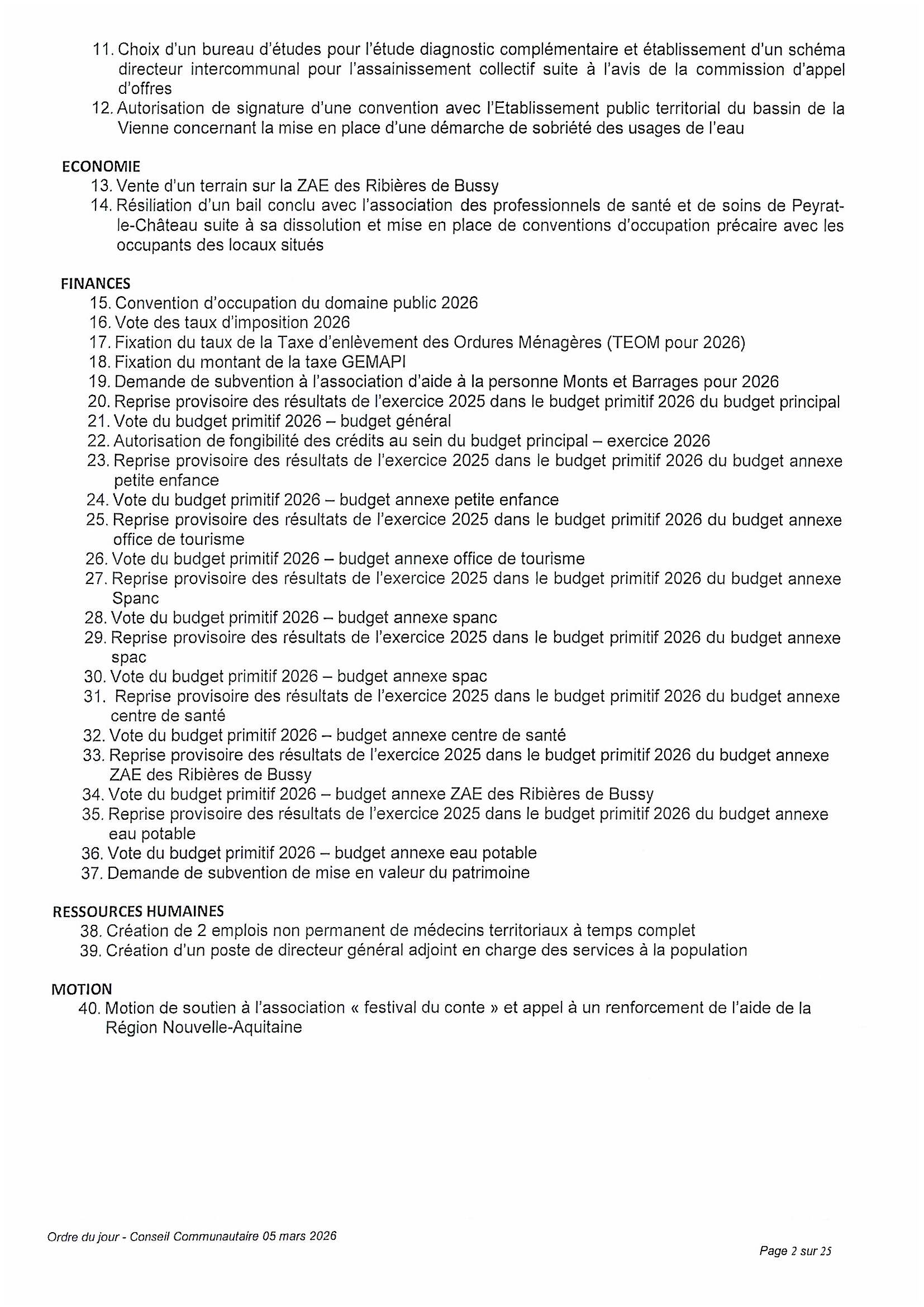 PROCHAIN CONSEIL COMMUNAUTAIRE – 5 MARS 2026 18H – BUJALEUF