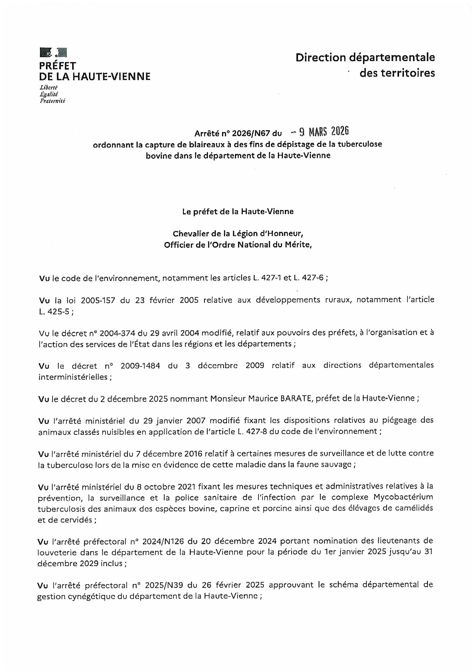 ARRETE PREFECTORAL – CAPTURE DE BLAIREAUX DANS LE DEPARTEMENT DE LA HAUTE-VIENNE