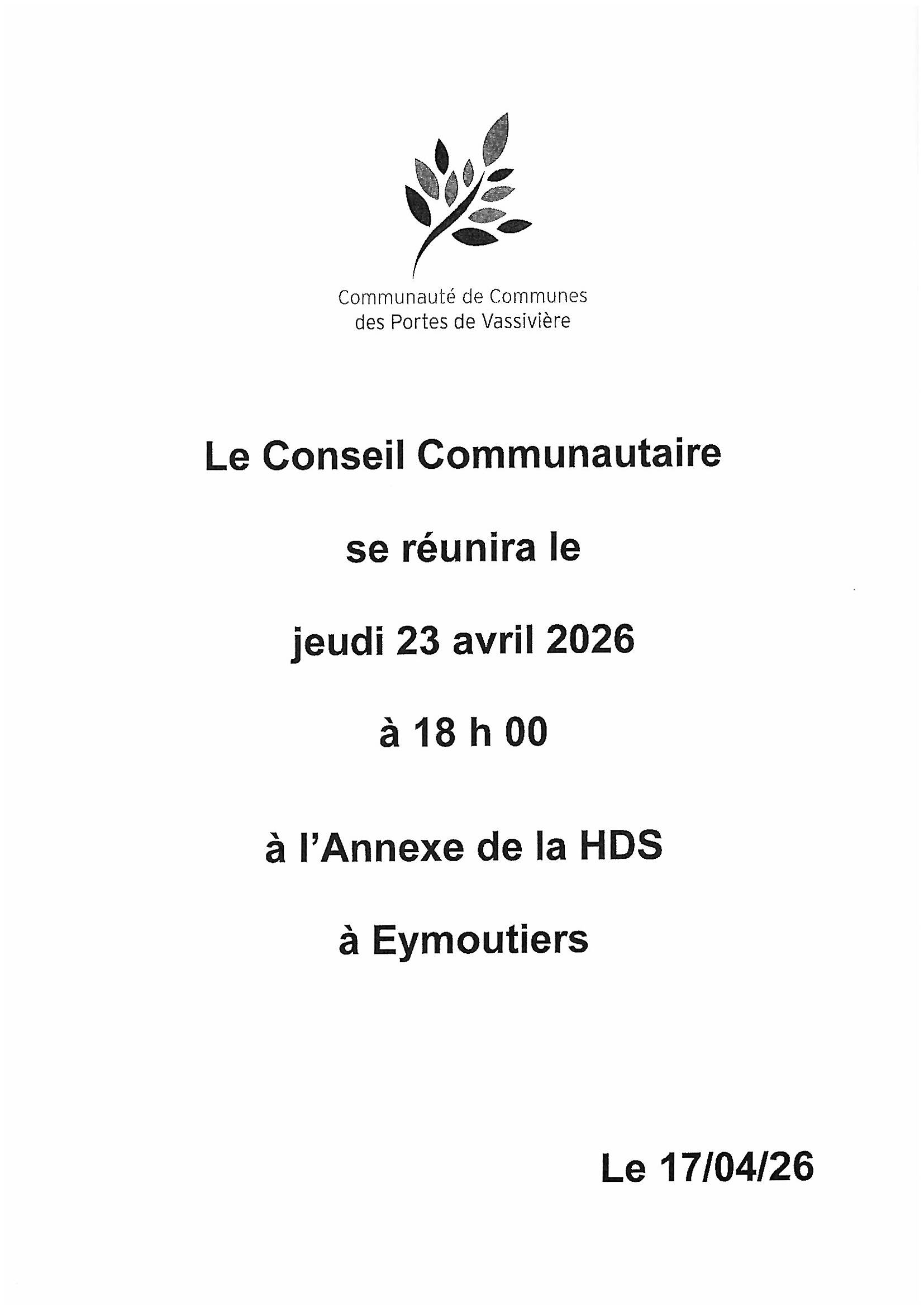 PROCHAIN CONSEIL COMMUNAUTAIRE – JEUDI 23 AVRIL 2026 – EYMOUTIERS